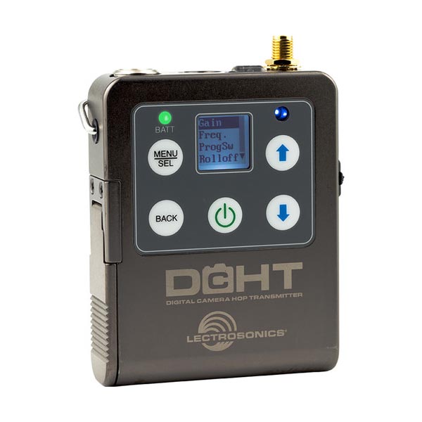 Designed for broadcast, film, and television production, the Lectrosonics DCHT is a wireless digital camera hop transmitter offering a reliable wireless connection between a bag- or cart-based audio system and cameras/recorders. This UHF transmitter tunes in coarse or fine increments from 470.1 to 607.95 MHz, and utilizes 256-bit encryption for secure signal transmission. With three selectable levels of RF power (10, 25, or 50mW) and a DSP-controlled input limiter, the DCHT delivers strong, clear, distortion-free audio.